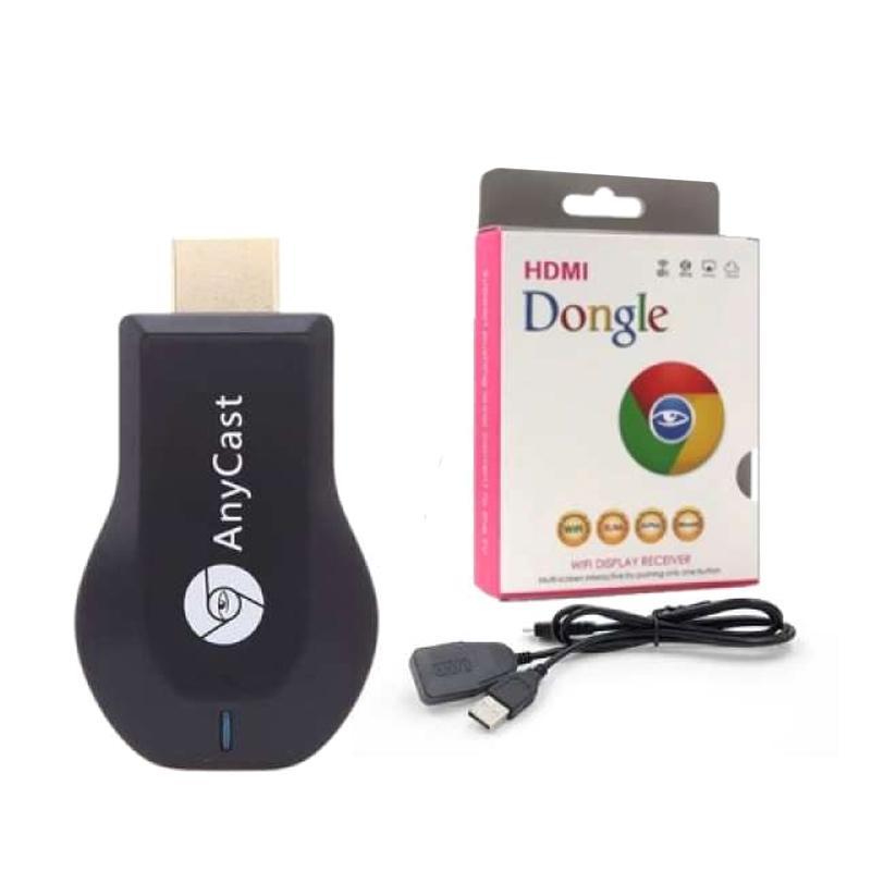 HDMI Dongle atau Anycast Wifi HDMI Dongle adalah sebuah alat yang dapat menyambungkan tampilan layar smartphone ke tv yang memiliki lubang HDMI. Selain smartphone, kamu juga bisa menyambungkan laptop ke tv. Bukan hanya tampilan berupa gambar, alat ini juga mampu menyambungkan video dan suara yang diputar di smartphone.